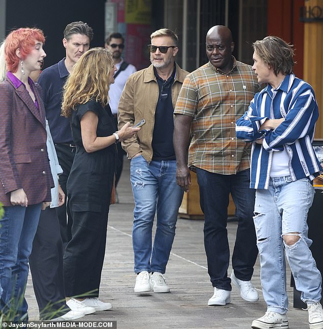 Take That’s Gary Barlow, Howard Donald, and Mark Owen were recently spotted meeting fans outside Channel Seven studios in Sydney as part of their successful This Life On Tour. The trio, who became famous in the 90s and are now back together, have been performing in packed arenas, with fans eagerly purchasing tickets for their concerts. Gary Barlow, aged 53, looked stylish in a brown utility jacket over a black Gucci polo, paired with ripped blue jeans and trendy shades. Howard Donald, aged 55, sported a casual rock-inspired look with a black leather jacket layered over a Pink Floyd t-shirt, denim, and white trainers, while Mark Owen, aged 52, showcased his quirky style in a blue and white striped overshirt along with distressed jeans and white trainers. The trio appeared in high spirits as they interacted with fans, taking selfies and signing autographs.