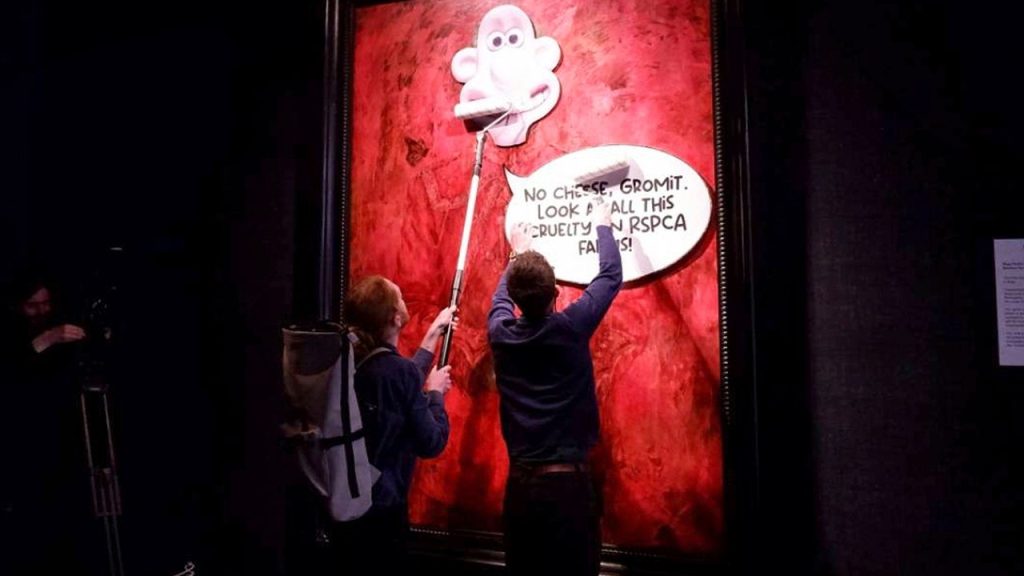 The incident at the Philip Mould Gallery involved pasting a speech bubble next to Wallace’s head that said, “No cheese, Gromit. Look at all this cruelty on RSPCA farms!” Despite the vandalism, the painting of King Charles III by Jonathan Yeo was not damaged as it was protected by a sheet of plastic. The gallery staff asked the protesters to leave, and the Metropolitan Police confirmed that the gallery did not wish to report a crime. The painting, unveiled last month, depicts King Charles in shades of red with his hands clasped on his sword hilt and a butterfly fluttering above his shoulder.