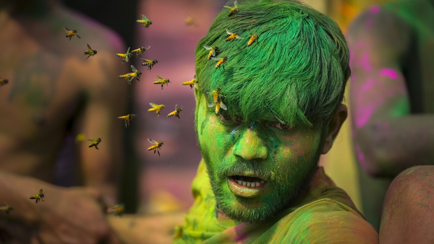 Anupam Nath, a photographer with 20 years of experience covering the Hindu festival of colors, Holi, captured a unique and extraordinary image in Guwahati, India. While photographing the celebrations, Nath noticed a man with colored powder on his face being attacked by a swarm of bees. Recognizing the moment’s significance, Nath quickly grabbed his camera and started clicking. To ensure the safety of his gear, Nath positioned himself on a stage away from the chaos, using a Sony A1 camera with a 70-200mm 2.8 lens to capture the close and clear frame without any cropping.