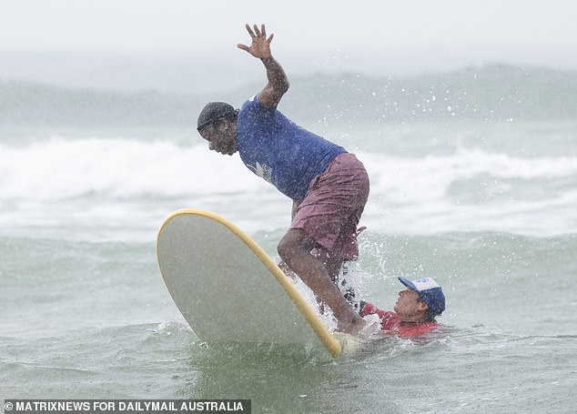 British comedian Stephen K Amos, known for being a self-confessed ‘non-swimmer,’ decided to challenge himself by taking private surfing lessons on the Sunshine Coast. Despite his previous fear of swimming, he donned a blue rash shirt and red board shorts to brave the rainy weather and choppy waters. With the help of a surf instructor, Stephen practiced his surfing moves on the sand before heading out into the ocean, where he struggled to catch some waves and had a few falls.