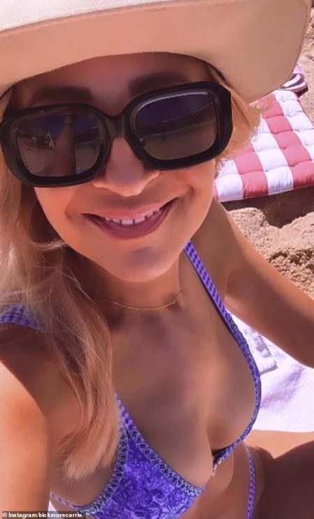 rewrite this title Carrie Bickmore puts on a very cheeky display during a family outing at the beach
