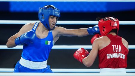 rewrite this title Algerian boxer Imane Khelif dominates Thai opponent to advance to gold medal bout