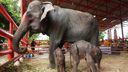Buddhist monks from Wat Traimit in Bangkok blessed twin baby elephants, a male and a female, born to mother Chamchuri…