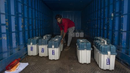 Helicopters, buses, trucks, boats, donkeys, and mules are being used by Indian officials to transport electronic voting machines for the…