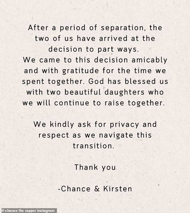 Chance the Rapper has announced his divorce from Kirsten Corley after five years of marriage and the couple’s decision was amicable. They shared a joint statement on Instagram Stories stating that they had reached this decision after a period of separation. The former couple, both 30 years old, expressed their gratitude for the time they spent together and mentioned their two daughters, Kensli and Marli, who they will continue to raise together. Chance and Kirsten have been together since they were children, started dating in 2013, got married in 2019, and had their second daughter later that year. The divorce announcement came a year after Chance was spotted dancing inappropriately with another woman during Carnival in Jamaica.