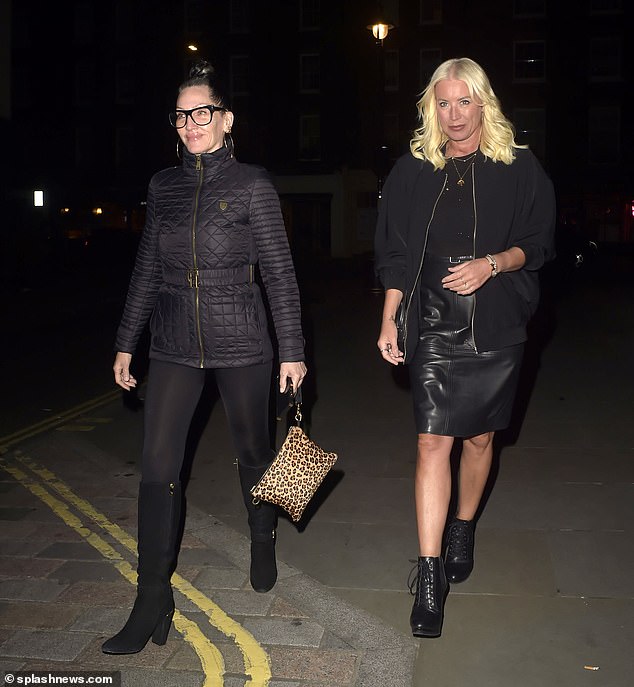 Denise Van Outen shows off her toned legs in a stylish black pleather skirt during a night out at the Chiltern Firehouse with friend Michelle Visage