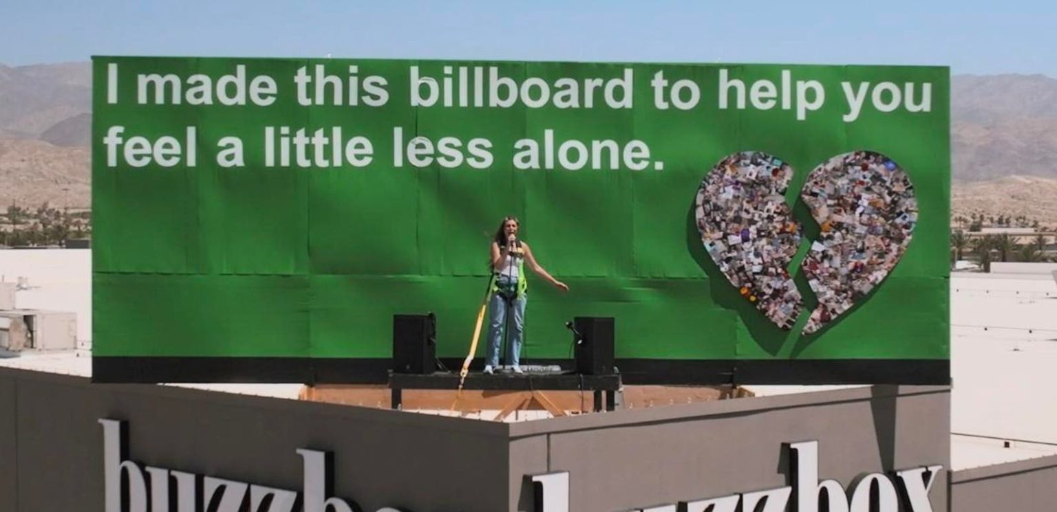 Indie singer/songwriter Emilee Moore made a bold statement at this year’s Coachella festival by performing her new single “Hanging On” multiple times from a custom billboard located along the route from Los Angeles to Indio. The activation was part of Moore’s mission to help those struggling with heartbreak, love lost, and desperation feel less alone. Moore’s inspiration for the billboard came from her own experiences with heartbreak, where she often looked for signs to make her feel less alone. The billboard also featured a huge broken heart created from fan-submitted items that they are still “hanging on” to from past relationships.