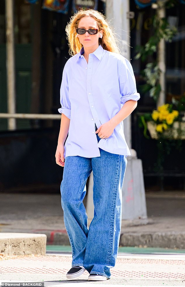 Jennifer Lawrence opts for a casual look in loose-fitting jeans and an oversized men’s shirt while running errands in New York City.