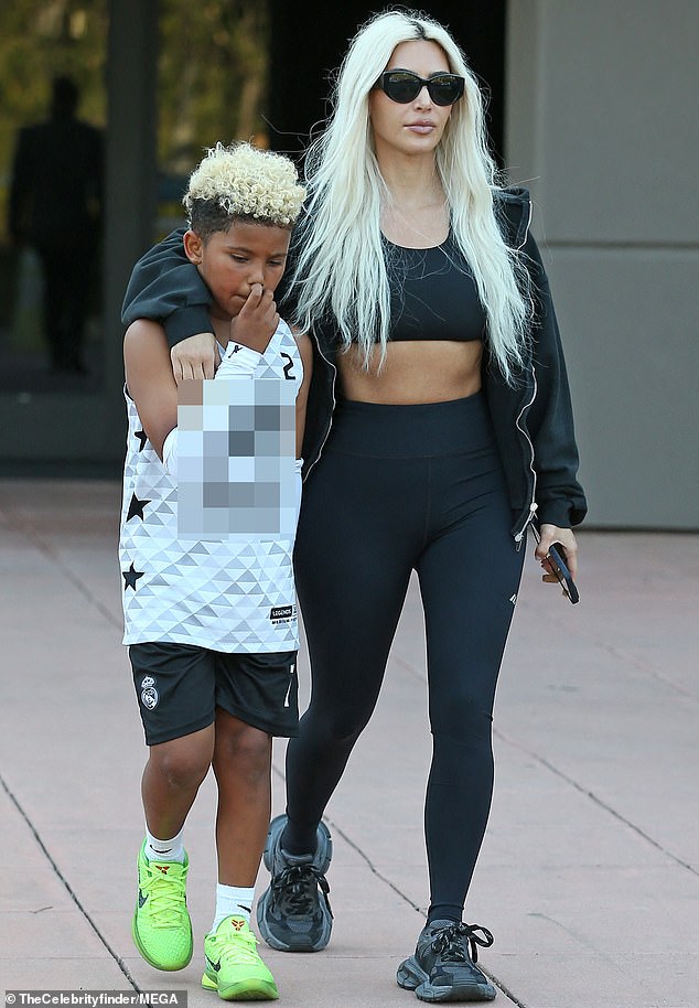 Kim Kardashian was seen arriving at her son Saint’s basketball game with matching blonde hair, matching her son’s own flaxen locks. Saint, who is eight years old, is one of the four children Kim shares with Kanye West. Kanye was also in attendance at the game, arriving separately from Kim. Kim displayed her new icy blonde hairdo, which she adopted at the end of last month, at the event. She wore sleek black workout gear and sunglasses, showing off her toned midriff.