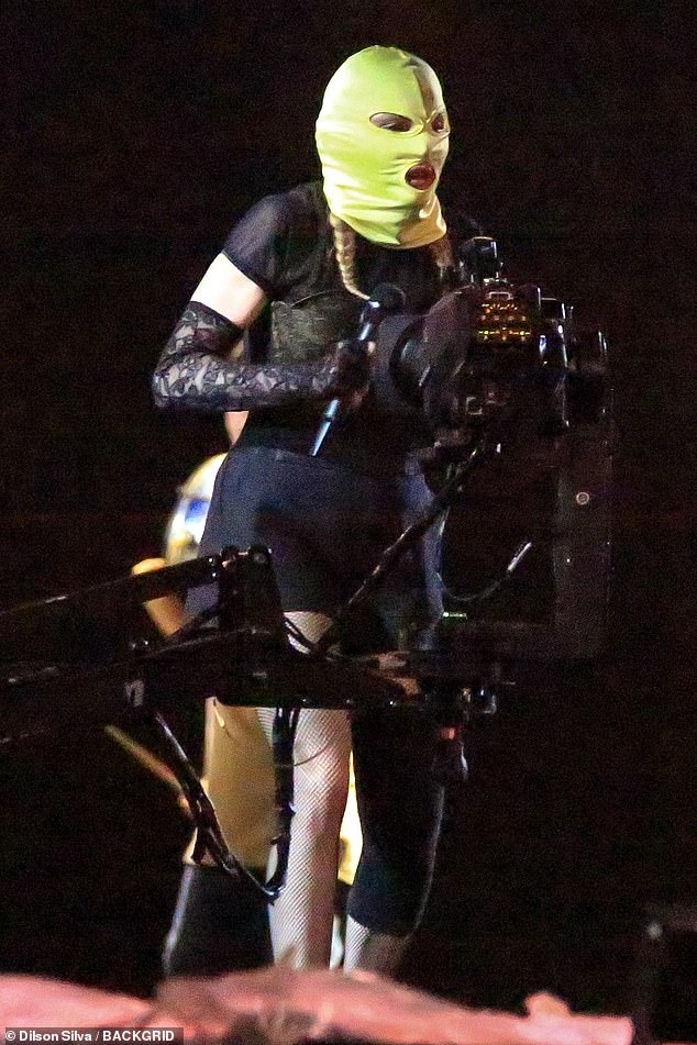 During rehearsals in Rio de Janeiro, Madonna covered her face with bondage hoods, including a latex lime green version and a black option. The singer, known for her iconic performances, switched between different outfits, such as a pair of shorts with a sheer T-shirt and lace opera gloves, as well as a figure-hugging velvet catsuit with huge shoulder pads. Madonna was joined by Brazilian artist Pabllo Vittar for a sound check and practiced her moves, including twerking and stomping around on stage in silver boots.