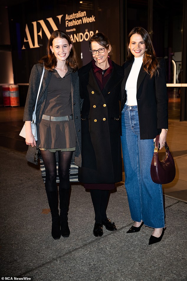 The Kidman-Hawley clan, including journalist Antonia Kidman and her daughters Lucia Hawley and Sybella Hawley, attended the first day of Australian Fashion Week 2024. Lucia, newly minted television presenter, signed with a major talent management agency, Chic Talent, and looked casually cool in a white top, black blazer, bell bottom jeans, carrying a snakeskin bag and wearing patent leather heels. Antonia, 63, and Sybella, 17, also attended the Carla Zampatti runway show, with Antonia wearing a maroon dress under a black trench coat and Sybella sporting an olive green utility dress with a grey coat and suede boots.