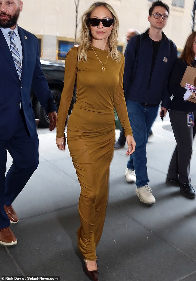 Nicole Richie stuns in a skintight gold dress for appearance on The Kelly Clarkson Show in NYC to discuss new film