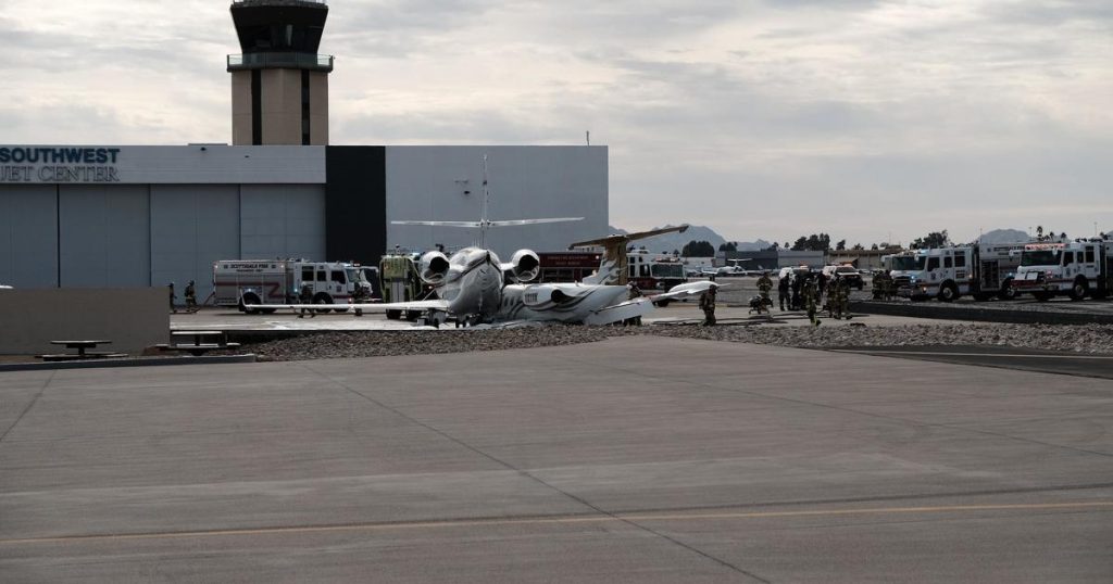 A midsize business jet collided off the runway at a private airport in Scottsdale, Arizona, on Feb. 10, 2025.