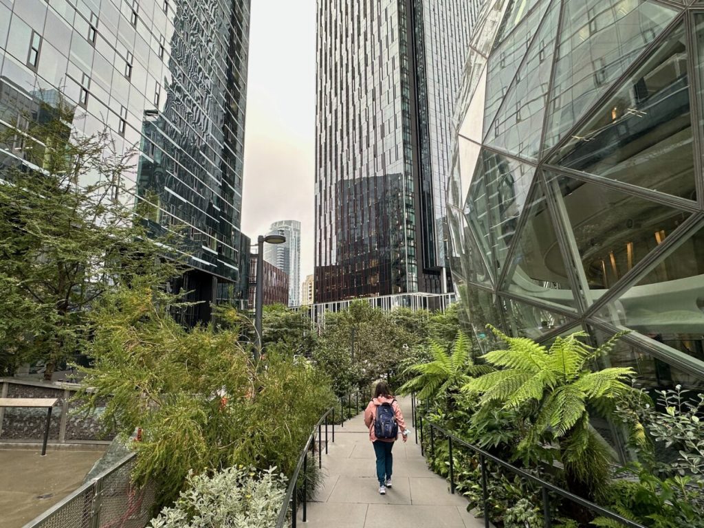 Amazon’s headquarters buildings and the Spheres in Seattle’s Denny Triangle neighborhood in September 2024. (GeekWire Photo / Kurt Schlosser)
