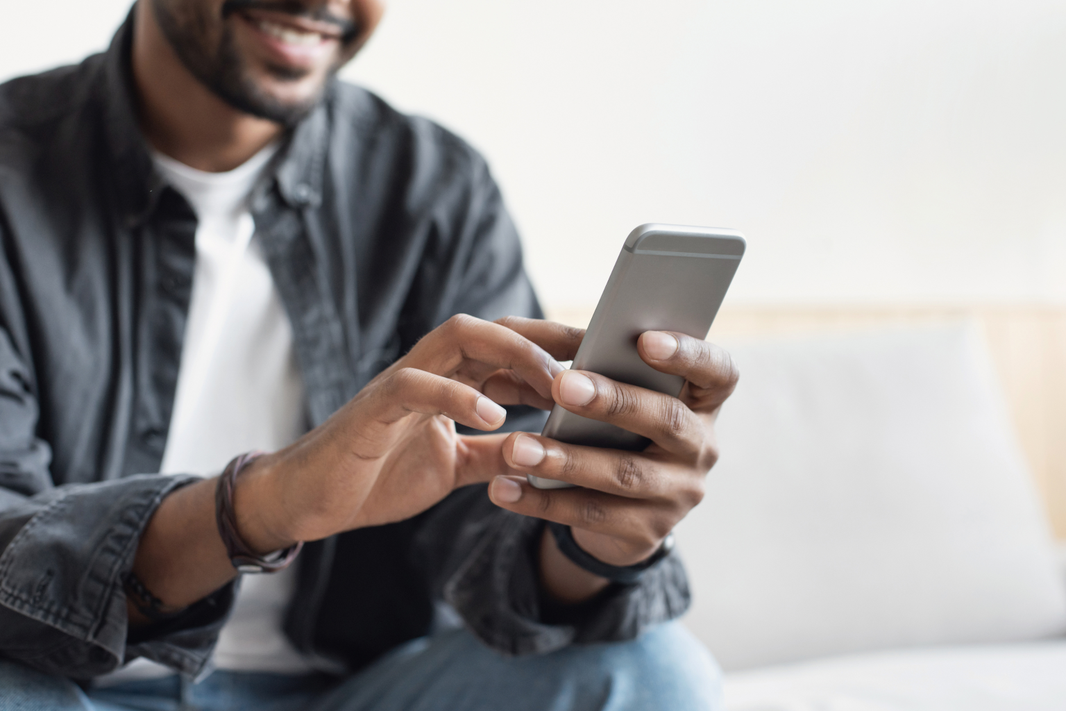 In this stock image, a man wearing jeans and a button-down shirt smiles while scrolling on his mobile phone.