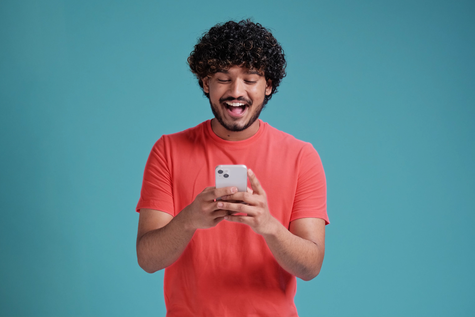 In this stock image, a man wearing a coral shirt against a blue background smiles while looking at his cell phone.