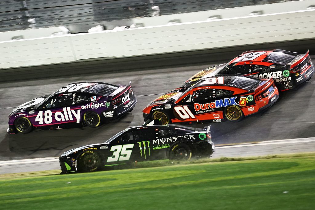 Alex Bowman, driver of the #48 Ally Chevrolet, Corey LaJoie, driver of the #01 Take 5 Oil Change/DuraMax Ford and Chase Briscoe, driver of the #19 Bass Pro Shops Toyota drive as Riley Herbst, driver of the #35 Monster Energy/Zero Sugar Toyota spins into the infield grass after an on-track incident during the NASCAR Cup Series Daytona 500 at Daytona International Speedway on February 16, 2025 in Daytona Beach, Florida.