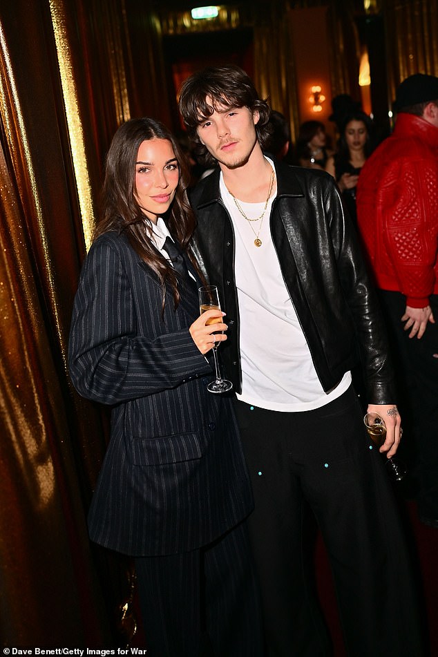 rewrite this title Cruz Beckham, 20, looks smitten with stylish girlfriend Jackie Apostel, 29, as they lead star arrivals at the Warner Music & Hennessy BRIT Awards after party
