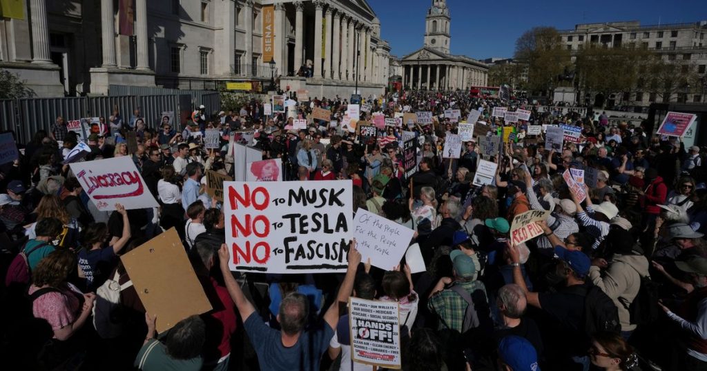 Summarize this content to 2000 words in 6 paragraphs Protesters have taken to the streets of cities across the globe, including London, Brussels, Washington, and Portland, over President Donald Trump and Elon Musk18:04, 05 Apr 2025Updated 18:05, 05 Apr 2025US residents in Lisbon hold placards as they protest against President Donald Trump and Elon Musk (Image: Corbis via Getty Images)Opponents of president Donald Trump and billionaire Elon Musk are rallying across the US Saturday’s demonstrations are being held in protest against the US administration’s actions on government downsizing, the economy, human rights and other issues.More than 1,200 Hands Off! demonstrations have been planned by more than 150 groups, including civil rights organisations, unions, LGBTQ+ advocates, veterans and fair-elections activists. The protests are planned for the National Mall in Washington DC, state capitols and other locations in all 50 states.Activists a few miles from Trump National Golf Club in Palm Beach Gardens (Image: AP)And the protests have now spread far beyond the United States, with people taking to the streets of cities in the UK, Belgium, Portugal and the Netherlands to show solidarity with the defiant demonstrators across the pond.Mr Trump has promoted his policies as being in the best interest of the US. Protesters are assailing the Trump administration’s moves to fire thousands of federal workers, close Social Security Administration field offices, effectively shutter entire agencies, deport immigrants, scale back protections for transgender people and cut federal funding for health programs.Protests in central London (Image: AFP via Getty Images)Mr Musk, one of the President’s advisers who owns Tesla, SpaceX and the social media platform X, has played a key role in government downsizing as the head of the newly created Department of Government Efficiency. He says he is saving taxpayers billions of dollars.Members of Indian Youth Congress, one carrying a damaged U.S. flag, protest against Trump’s tariffs in New Delhi, India (Image: AP)Speaking at the Washington protest, Paul Osadebe, a lawyer for the US Department of Housing and Urban Development and a union steward, criticised Mr Trump, Mr Musk and others in the administration for not valuing the work federal employees do in creating “a baseline of economic security and power for working people”.He said: “Billionaires and oligarchs don’t value anything other than profit and power, and they sure as hell don’t value you or your life or your community. And we’re seeing that they don’t care who they have to destroy or who they have to hurt to get what they want.”Protesters gather outside the Minnesota State Capitol(Image: AFP via Getty Images)In Massachusetts, thousands of people gathered on Boston Common holding signs including: “Hands off our democracy”; “Hands off our Social Security”; and: “Diversity equity inclusion makes America strong. Hands off!”Asked about the protests, the White House said in a statement” “President Trump’s position is clear: he will always protect Social Security, Medicare, and Medicaid for eligible beneficiaries. Meanwhile, the Democrats’ stance is giving Social Security, Medicaid, and Medicare benefits to illegal aliens, which will bankrupt these programs and crush American seniors.”Activists have staged nationwide demonstrations against Mr Trump or Mr Musk multiple times since the new administration took power. But the opposition movement has yet to produce a mass mobilisation like the Women’s March in 2017, which brought thousands of women to Washington, DC, after Mr Trump’s first inauguration, or the Black Lives Matter demonstrations that erupted in multiple cities after George Floyd’s killing in 2020. Organisers say they hope Saturday’s demonstrations will be the largest since Mr Trump returned to office in January.
