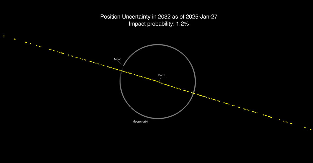 Summarize this content to 2000 words in 6 paragraphs Astronomers have been carefully watching 2024 YR4, a space rock with a heightened chance of hitting Earth in 2032. But fear not: NASA announced on Monday that it posed a threat no longer — the odds that the asteroid would smash into our planet have dropped to nearly zero.“I knew this was likely to go away as we collected more data,” said Davide Farnocchia, a navigation engineer at the NASA Jet Propulsion Laboratory in California. “I was sleeping pretty well.”Days after skywatchers reported their observations of 2024 YR4 on Dec. 27, 2024, scientists calculated that it had more than a 1 percent chance of striking Earth — the only large asteroid known to have an impact probability so big.As scientists studied more data on the object, the odds of impact continued to rise through January and February, from 1.2 percent to a peak of 3.1 percent on Tuesday last week.That may sound small, but the probability was higher than any ever recorded by NASA for an object of this size or bigger.Somewhere between 130 and 300 feet wide, 2024 YR4 is big enough to potentially wipe out a city. Early estimates of the asteroid’s trajectory showed it could possibly slam into or explode in the air over large metropolitan areas, including Mumbai, India, and Lagos, Nigeria. But the day after the 3.1 percent forecast, the odds that 2024 YR4 would slam into Earth began to drop, to 1.5 percent on Feb. 19, and then to 0.3 percent the day after. On Monday afternoon, NASA shared the “all clear” in a post on X, noting that the probability had further diminished to 0.004 percent, or a one in 25,000 chance.According to Dr. Farnocchia, that value is already outdated. The newest estimate is even smaller: a one in 59,000 chance.The probability of impact has shifted in the past two months as astronomers gathered more information about the asteroid from ground-based telescopes. With additional data, the uncertainty of its route through the solar system began to shrink, eventually so much so that planetary defenders decided we were no longer in danger.“This is normal behavior, what you would expect when you discover an asteroid,” Dr. Farnocchia said. It is “just the scientific process at work,” he added.While Earth may have evaded destruction by way of asteroid, NASA said there was a slight chance — about 1.7 percent — that 2024 YR4 would crash into our moon, creating yet another crater on its speckled surface.The agency is continuing to monitor the asteroid from observatories around the world, including with the Lowell Discovery Telescope in Arizona and the Nordic Optical Telescope in the Canary Islands. By the end of April, 2024 YR4 will be hidden from our view until 2028.“The asteroid is going to do what it’s going to do,” Dr. Farnocchia said. That astronomers found it and measured the odds of a collision so far in advance, he added, “is actually a good sign that we’re doing what we’re supposed to do to deal with the risk of asteroid impacts.”