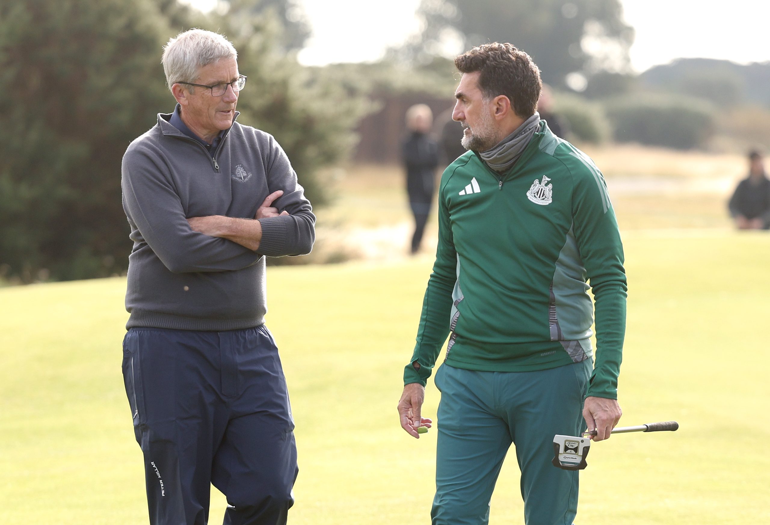 Jay Monahan, Commissioner of the PGA Tour and Yasir Al-Rumayyan, Governor of Saudi Arabia’s Public Investment Fund interact during day one of the Alfred Dunhill Links Championship 2024 at Carnoustie Golf Links.