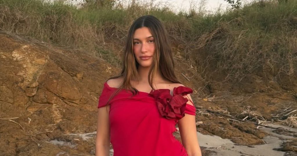 rewrite this title Hailey Bieber Is Radiant in Red on Beach Trip With Justin Bieber