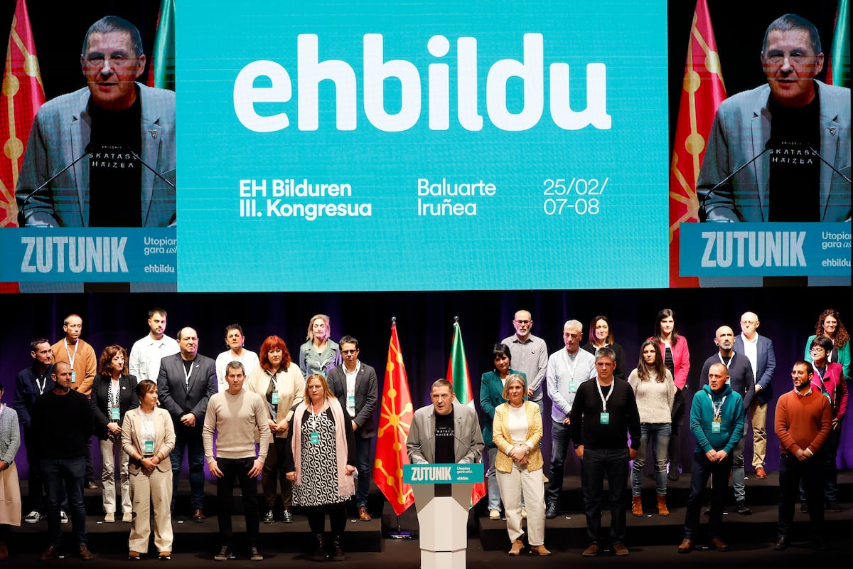 Summarize this content to 2000 words in 6 paragraphs in english EH Bildu ha reelegido este sábado a Arnaldo Otegi como secretario general de la formación independentista con los votos del 94,4% de la militancia. Ha recibido un “apoyo a la búlgara”, según sus propias palabras. No tenía contestación al no haberse presentado al III Congreso, clausurado hoy en Pamplona, ningún otro candidato para dirigir un partido que ya está mirando al futuro próximo con el objetivo de superar al PNV y dar el salto a las principales instituciones vascas. Otegi ha dejado esto muy claro en su discurso final cuando ha lanzado la siguiente advertencia: “Estamos preparados para llegar al poder y para gobernar”.La coalición soberanista sale de su cita congresual con una dirección nueva que pasará a tener dos órganos principales, ambos liderados por Otegi: una Ejecutiva permanente de 16 miembros que se encargará del día a día, y la Mesa Política, formada por 33 personas, que se reunirá cada dos meses. El núcleo duro de Otegi estará compuesto por Sonia Jacinto como responsable de Organización; Arkaitz Rodríguez, que deja la dirección de Sortu y pasa a ser secretario de Acción Política, y la parlamentaria Nerea Kortajarena al cargo de Programas. También se suman a este grupo de elegidos el portavoz parlamentario Pello Otxandiano, la responsable de redactar la ponencia política Miren Zabaleta y Unai Urruzuno.El nuevo secretario general (antes coordinador general) se ha mostrado “orgulloso” por la labor que está realizando EH Bildu los últimos meses para “construir un frente amplio” para conseguir “elevar el campamento base del autogobierno lo máximo posible hasta la cima”. Ha citado las dos claves que marcan la hoja de ruta de la coalición: “antineoliberalismo y soberanía nacional”.La formación independentista ha lanzado el guante al resto de fuerzas que “reconocen la condición de nación de Euskal Herria” para transformar el actual estatus político. Otegi se ha dirigido a las fuerzas nacionalistas (el mensaje va especialmente dirigido al PNV) y a la izquierda confederal para proponerles la formación de “listas conjuntas” para las elecciones generales y las europeas “sobre la base de un programa mínimo común de amplio consenso”. Estos partidos irían por separado y con sus siglas a las contiendas electorales municipales y autonómicas.La ponencia política, que ha recibido un respaldo superior al 90%, aboga por emprender un “proceso gradual” hacia la soberanía y la constitución de una “república confederal vasca” partiendo de las instituciones actuales y basada en acuerdos entre las fuerzas políticas y sociales vascas, previos a una negociación con el Estado. Es una estrategia más posibilista y menos rupturista.En el horizonte de EH Bildu también figura convertirse en la referencia política en el País Vasco, en Navarra y la parte vascofrancesa. En las últimas elecciones vascas de 2024 se quedaron a menos de 30.000 votos del PNV, con los mismos parlamentarios (27 cada uno), por lo que Bildu quiere beneficiarse de su tendencia al alza en los últimos comicios y aprovechar que su histórico rival, el PNV, se encuentra metido en problemas tras la renuncia de su presidente Andoni Ortuzar. Otegi no ha citado a esta formación, pero sí ha comentado en su alocución que en EH Bildu “no se debate sobre puestos, sino sobre ideas y propuestas políticas”.Este llamamiento a la unidad dirigido, entre otros, al PNV figura en una de las tres resoluciones aprobadas por la asamblea y ratificadas hoy por el congreso con un apoyo del 96,3%. “Como pueblo”, dice el documento, “tenemos que aprovechar las oportunidades para mostrar nítidamente a Euskal Herria y sus reivindicaciones. Para demostrar que existe un pueblo, que ese pueblo reclama derechos y que en él se están conformando mayorías para ejercerlos”.En pie. Somos libres en la utopía (en euskera) ha sido el lema del congreso, que ha arrancado con gritos a “independencia” y donde Otegi se ha presentado con una camiseta con un mensaje que decía: “Askatasuna haizea” (Viento de libertad). Venía a propósito del verso del Che Guevara “Mañana, cuando yo muera, no me vengáis a llorar. Nunca estaré bajo tierra, soy viento de libertad”, que escribió Juan Paredes Txiki (miembro de ETA político-militar), en una foto familiar poco antes de ser fusilado hace ahora 50 años y a quien Otegi ha querido citar en su discurso.EH Bildu ha elegido Pamplona para celebra congreso, al que Otegi llega a punto de cumplir 67 años. La capital navarra tiene una carga simbólica especial para los seguidores de esta formación. Su alcalde, Joseba Asiron, llegó al cargo en diciembre de 2023 tras prosperar una moción de censura apoyada por los socialistas contra la entonces alcaldesa de UPN, Cristina Ibarrola. En Navarra gobierna el PSN gracias a la abstención de EH Bildu las dos últimas legislaturas y los presupuestos regionales de los últimos seis años han recibido el apoyo de los soberanistas.