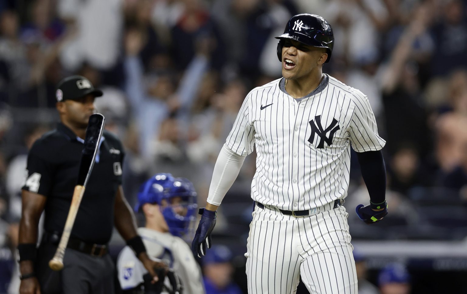 NEW YORK, NEW YORK – SEPTEMBER 11: Juan Soto #22 of the New York Yankees reacts after his sixth inning two run home run against the Kansas City Royals at Yankee Stadium on September 11,…