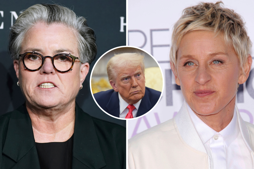 L: Rosie O’Donnell in Los Angeles on November 19, 2024. R: Ellen DeGeneres in Los Angeles on January 7, 2015. Inset: President Donald Trump at the White House on March 12, 2025.