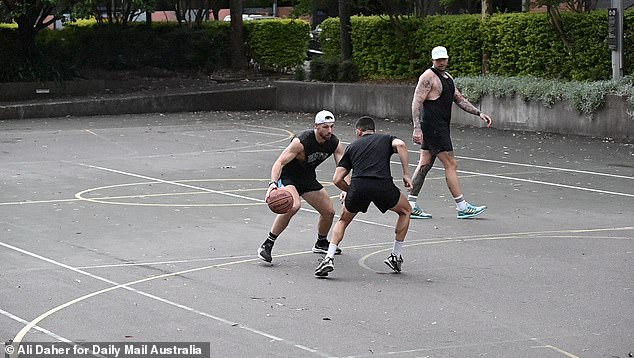 rewrite this title Married At First Sight’s Teejay Halkias enjoys a game of basketball with Dave Hand and Jeff Gobbels after disastrous Homestays week with his ‘wife’ Beth