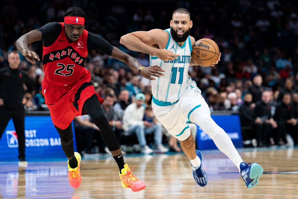 CHARLOTTE, NORTH CAROLINA – OCTOBER 30: Cody Martin #11 of the Charlotte Hornets goes to the basket while guarded by Chris Boucher #25 of the Toronto Raptors in the third quarter during their game at Spectrum Center on October 30, 2024 in Charlotte, North Carolina.