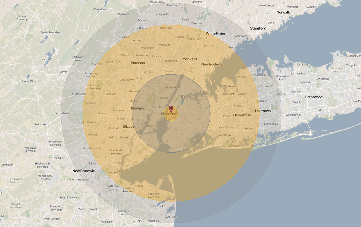 A map showing the impact of an attack with the China’s Dong-Feng 5 on New York. Newsweek used maps produced by Alex Wellerstein to compare different countries’ nuclear weapons.