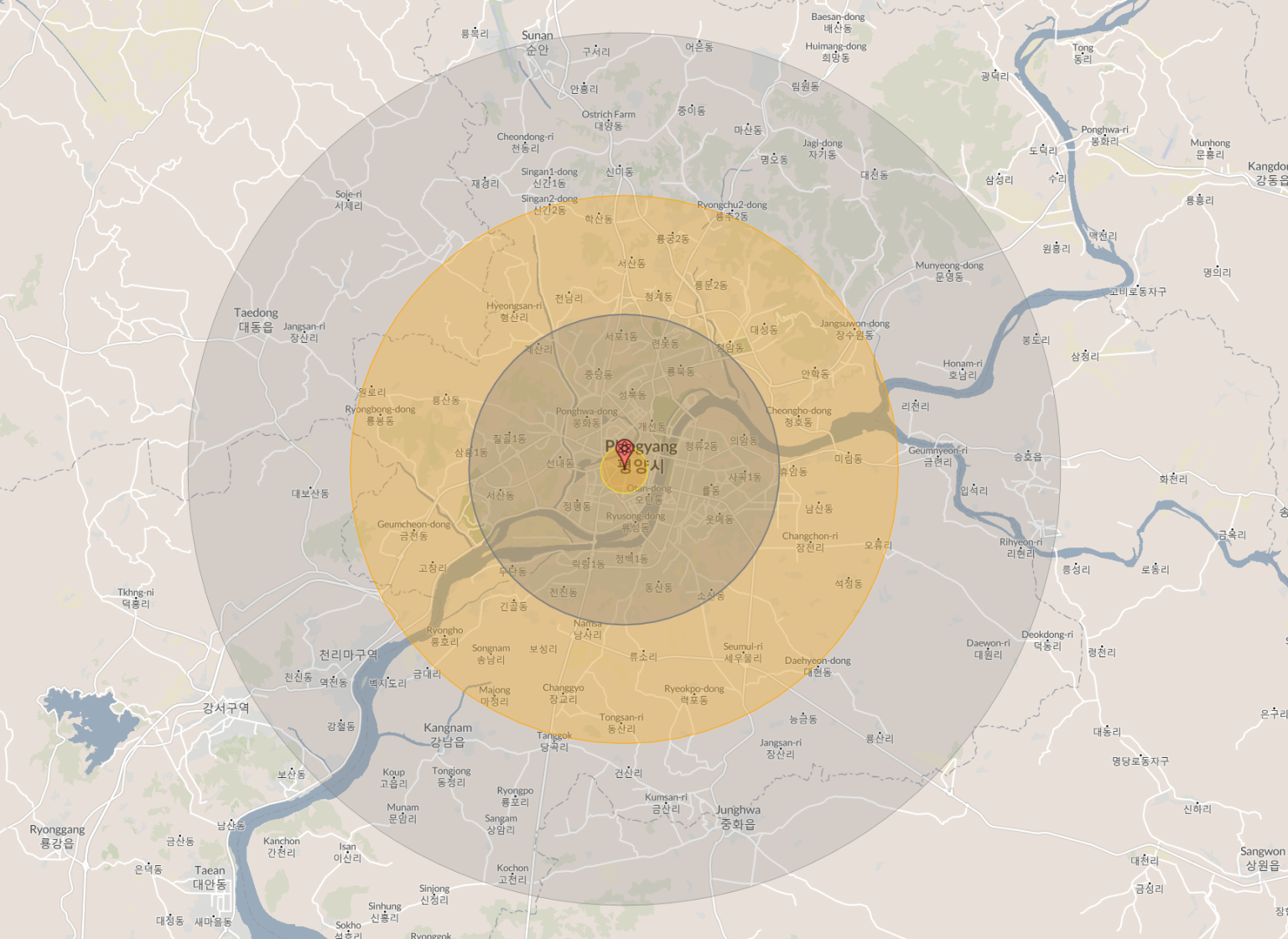 A map showing the impact of an attack on Pyongyang. Newsweek used maps produced by Alex Wellerstein to assess what the impact would be if the U.S. attacked with the B-83.