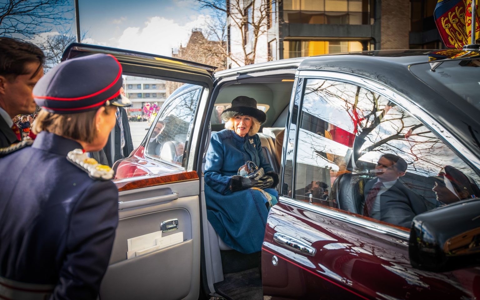Queen Camilla’s limousine stops in front of the crowd of cheering supporters in Middlesbrough, northeast England.