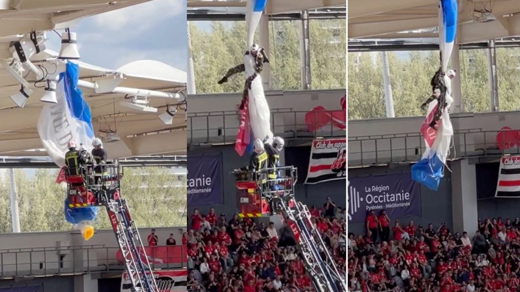 Summarize this content to 2000 words in 6 paragraphs Fans at a European Rugby Champions Cup match in France watched as a parachutist needed to be rescued as he got stuck on top of the stadium roof on Sunday.A video showed rescue workers in Toulouse rushing to help the dangling parachutist and the match was delayed. The man, who was reportedly a French soldier, was descending quickly when the right side of his parachute became stuck on the roof. He was dangling about 50 feet above the crowd that came to watch Toulouse take on the Sale Sharks.Firemen needed a long ladder to reach the parachutist and safely rescue him. The man appeared unharmed as he was helped down. The crowd began to cheer as he reached safety.The firemen also received a huge cheer once they were able to pull the parachute down.PUTIN CONGRATULATES ALEX OVECHKIN AFTER BREAKING NHL RECORDThe delay lasted about 40 minutes.”Following the incident at le Stadium de Toulouse, we would like to extend our sincere thanks to all involved at the stadium, both clubs and the emergency services for safely returning the parachutist to the ground,” European Professional Club Rugby chairman Dominic McKay said in a statement on social media. Toulouse ended up winning the match 38-15.The Associated Press contributed to this report.Follow Fox News Digital’s sports coverage on X, and subscribe to the Fox News Sports Huddle newsletter.