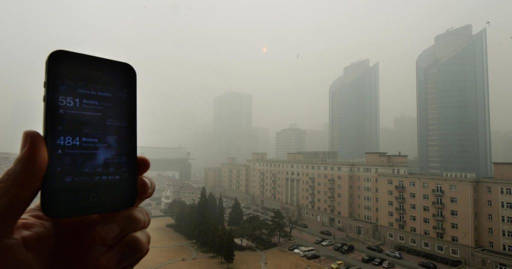A cellphone shows the U.S. Embassy pollution index reading of 551, which is extremely hazardous, and the Chinese government reading of 484, in Beijing on Feb. 26, 2014.