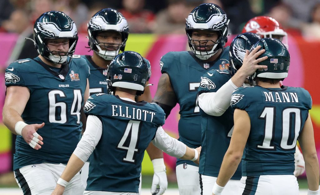 NEW ORLEANS, LOUISIANA – FEBRUARY 09: Jake Elliott #4 of the Philadelphia Eagles celebrates with teammates after kicking a field goal in the third quarter against the Kansas City Chiefs during Super Bowl LIX at Caesars Superdome on February 09, 2025 in New Orleans, Louisiana.
