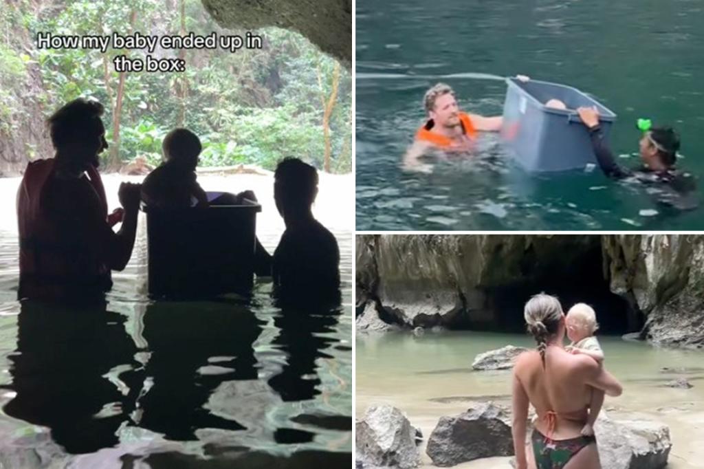 A globetrotting pair of Norwegian travel influencer parents left their followers divided after posting footage from an tour of underwater caves in Thailand — showing them toting an infant along in a storage bin.