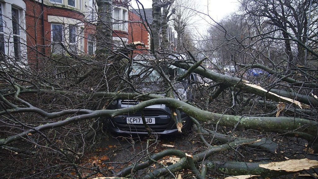Two people have been killed and hundreds of thousands of people are without power across the UK and Ireland as high winds and heavy rain from Storm Darragh battered the region.Gusts of up to 149 kilometres per hour were recorded as officials sent a rare emergency alert by phone to about three million households in Wales and southwest England early on Saturday.The official alert, which came with a loud siren-like sound, warned people to stay indoors and was sent to every compatible mobile phone in the areas impacted by Storm Darragh.In northwest England, a man in his 40s died when a tree fell onto his van while he was driving on a highway near Preston, about 58 kilometres north of Manchester.And in a similar incident, another man was killed by a falling tree while he was driving in the Erdington area of Birmingham.The UK’s main weather forecasters, the Met Office, issued a red weather warning on Friday but in a post on X on Saturday evening said that Storm Darragh would clear eastward on Sunday morning but advised windy conditions would continue across much of the UK.Thousands of homes, many in Northern Ireland, Wales and western England, were left without power overnight.Major highways and bridges across the country were closed because of strong winds and multiple train services were suspended.In Ireland, almost 400,000 homes, farms or businesses were without power as a result of the storm.Some flights at Dublin Airport were also cancelled.