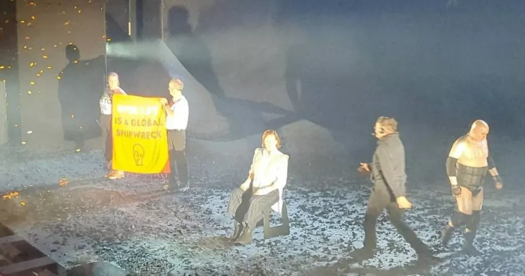 Summarize this content to 2000 words in 6 paragraphs Just Stop Oil protestors halted a West End performance of The Tempest while Hollywood star Sigourney Weaver performed on stage, leaving the show in chaos08:19, 28 Jan 2025Updated 08:23, 28 Jan 2025Sigourney Weaver sat on stage as Just Stop Oil protestors halted the show(Image: PA)Just Stop Oil activists halted a West End production as they stormed onto stage while Sigourney Weaver performed.Chaos unfolded last night as the protestors took to the stage at Theatre Royal, Drury Lane. They held up their orange banner during a production of Shakespeare’s The Tempest. The two activists decided to make their entrance as Weaver delivered the line “Come forth” as another character emerged from the floor.They launched a confetti canon while one of them said: “We’ll have to stop the show ladies and gentlemen, sorry.” The activists were met by boos and whistles from the audience as well as shouts of “get them off the stage”. Weaver had been sat on a chair in the middle of the stage at the time but was escorted off.Protestor Hayley Walsh, 42, responded to backlash for the stunt as social media users fumed: “Disrupting art and a performance is not cool.” The lecturer and mum-of-three from Nottingham said: “I am scared for my children, I can’t sleepwalk them into a future of food shortages, life-threatening storms and wars for resources.The two protestors halted the performance as they jumped on stage(Image: PA)”Years of writing to MPs, going on marches and teaching my students to be more sustainable, hasn’t seen the urgent change needed.” The other protestor, mechanical engineer Richard Weird, from North Tyneside, added: “We’re already seeing the damage this crisis is doing to crops, homes and entire neighbourhoods.”Unless we come together and demand a move away from fossil fuels by 2030, we will go the same way as manufacturing in the UK.” The banner they held up read: “Over 1.5 Degrees is a Global Shipwreck.” It is in reference to an announcement that 2024 had seen this limit exceeded.A spokesman for Just Stop Oil added: “Acientists warn that surpassing 1.5 degrees over pre-industrial levels will trigger catastrophic feedback loops that threaten the stability of all life on earth.”Sigourney Weaver’s play opened on December 19 and will run until February 1 this year. The Alien actress, 74, portrays the storm-creating magician Prospero in the new staging of the Shakespeare classic. She previously said: “I am delighted to be making my West End debut in Shakespeare’s The Tempest directed by the brilliant Jamie Lloyd – and to do so in Andrew Lloyd Webber’s beautiful and historic Theatre Royal Drury Lane is an extraordinary opportunity. Come and see us!”However, the play has racked up a string of bad reviews, which have reportedly put some people off seeing it. Ticket costs have already been slashed from £231 to £85 earlier this month.In November, Just Stop Oil protestors painted the US embassy in London in response to Donald Trump’s election win. Two people from the campaign group splattered orange paint across the building in central London, hours after Trump announced his victory. In a statement, they said are “demanding governments work together” to end the extraction and burning of oil, gas and coal by 2030.Follow Mirror Celebs on TikTok, Snapchat, Instagram, Twitter, Facebook, YouTube and Threads.