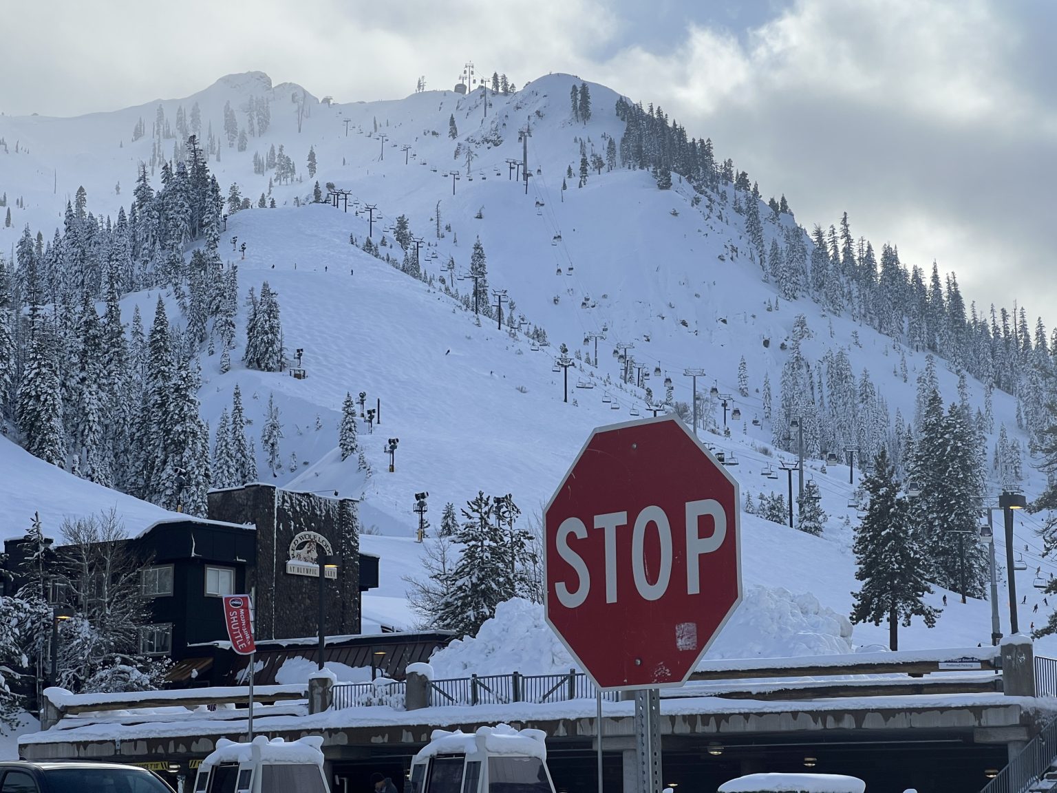 Stop sign in front of snow-covered ski slopes and chairlifts at a mountain resort on a cloudy morning, Olympic Valley, California, February 14, 2025.