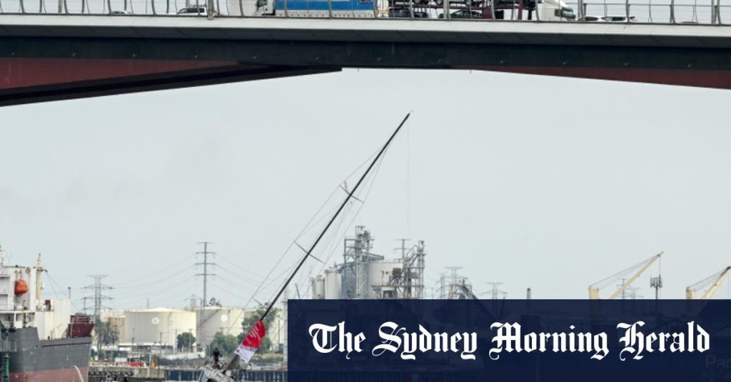 rewrite this title Yacht Alive tilts under the Bolte Bridge in preparation for Melbourne to Osaka race