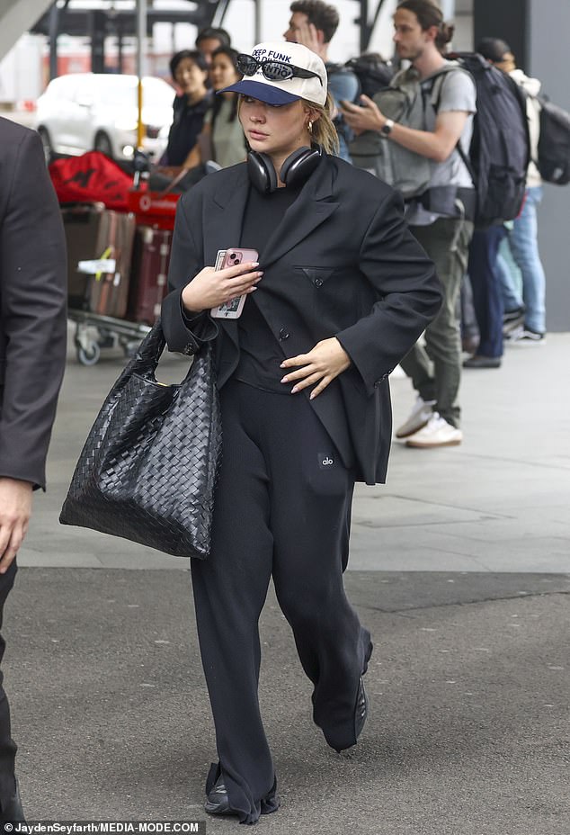 Hollywood’s newest ‘it’ girl, Madelyn Cline, arrived in Sydney ahead of her starring role in the reboot of “I Know What You Did Last Summer”. Despite a whirlwind 72-hour trip to Los Angeles, where she greeted fans and smiled for photographers, Cline looked fresh and radiant upon her arrival in Sydney. She sported an oversized black blazer, wide-legged trousers from Alo, and a simple black top, creating a monochromatic ensemble that exuded confidence. Her blonde locks were tucked under a cream and navy baseball cap, and she carried a woven black tote bag.