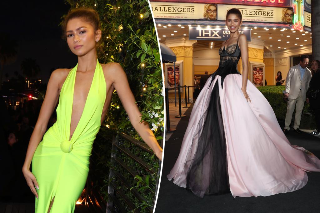 Zendaya attended the Los Angeles premiere of her new movie, “Challengers,” showcasing two contrasting looks. She started off on the red carpet in a custom Vera Wang Haute gown featuring a black lace bustier and pale pink satin skirt with a dramatic train. Zendaya, who plays a tennis coach in the film, accessorized with diamond studs and wore her hair in an updo, deviating from her previous tennis-themed press tour outfits, leaving fans intrigued about the sudden change in style. Once inside the theater, she changed into a plunging bright green gown resembling a tennis ball, complete with a sliced tennis ball accent at the waist, and paired with nude pumps.